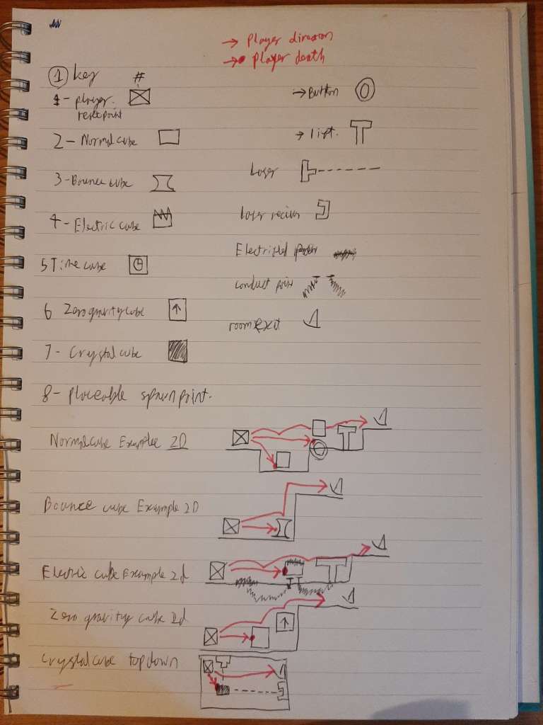 The initial idea was planned on paper, with sketches of puzzle ideas and listing possible items the player can spawn. These ideas were expanded by creating interactions between these items that would lend themselves to puzzles.