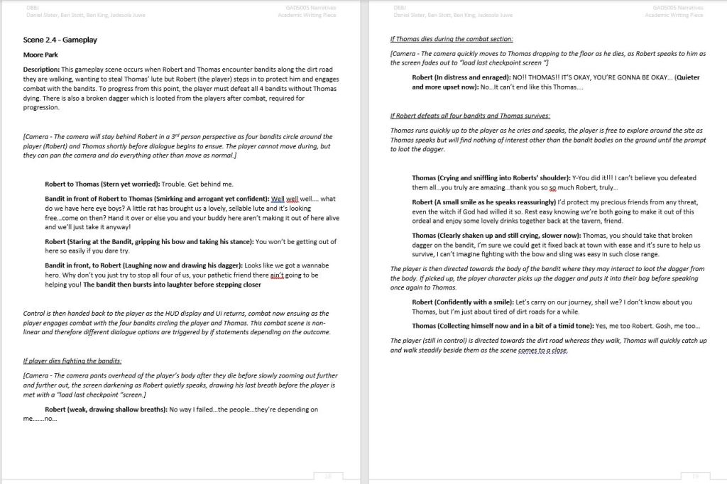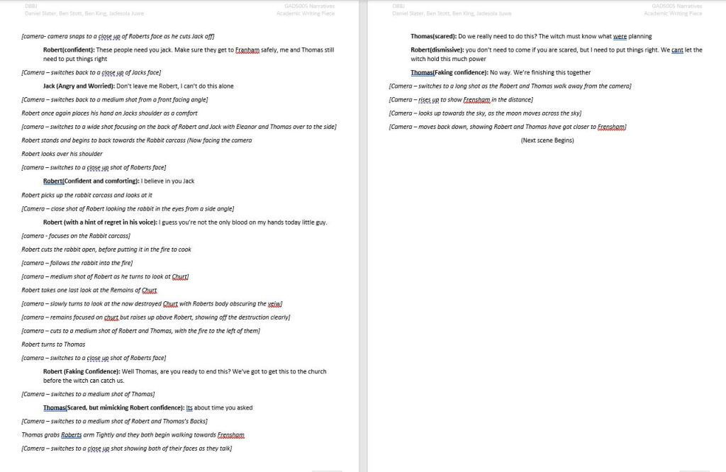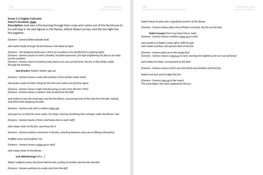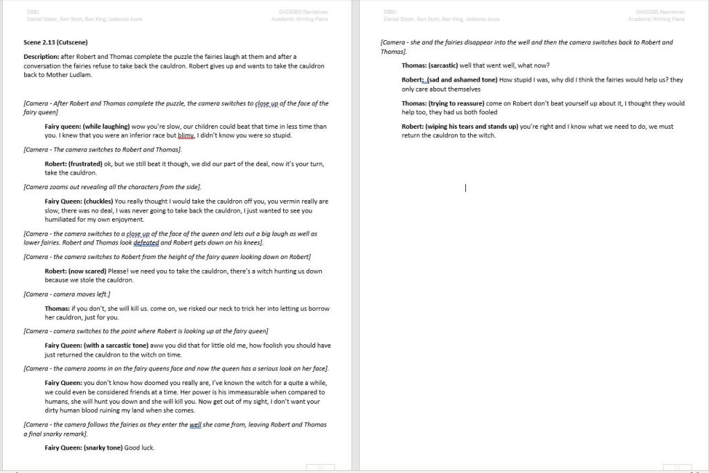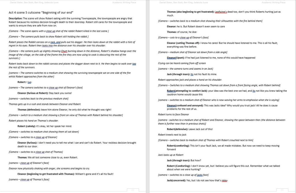 This sample scene is written by myself. This cutscene takes place at the end of act 4 and covers the protagonists relationship with other members of the town, aswell as the decision to take the cauldron to Frensham Church.