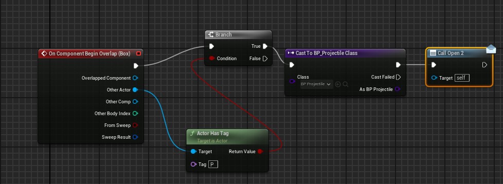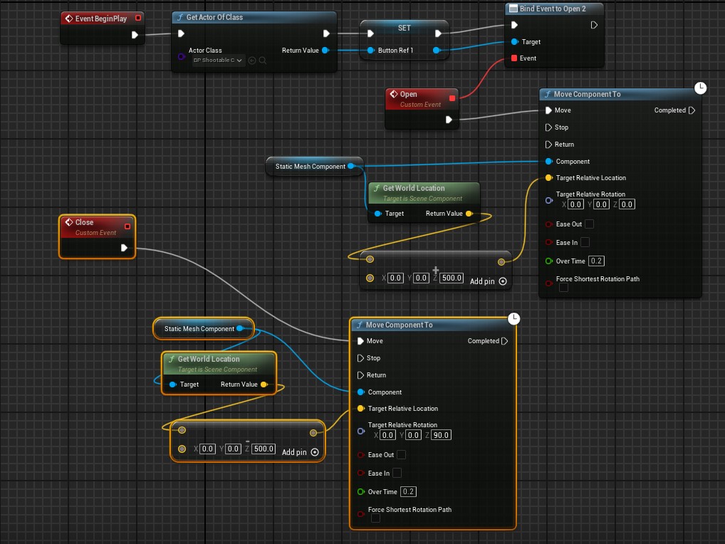 These blueprints work by checking that a projectile collided with the button, if it did then a custom event will play within the door blueprint. This will move the door upwards, opening it and allowing the player to pass.