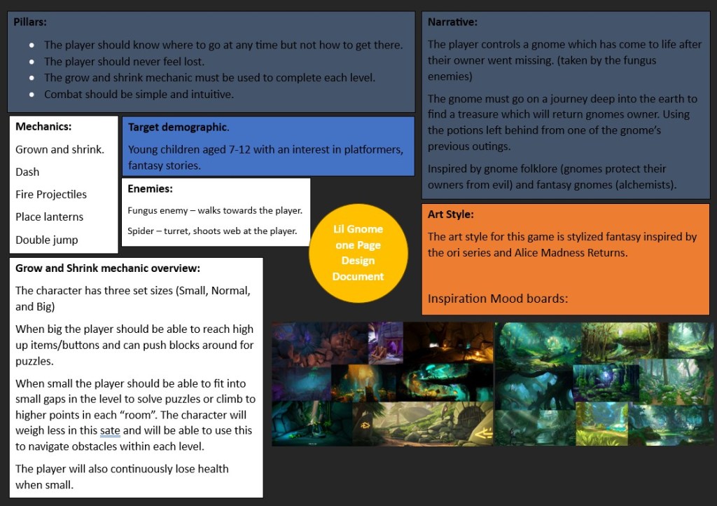 Lil Gnome is a third-person puzzle platformer with third-person shooter combat made in Unreal Engine 5.2. The main mechanic allows the player to shrink/ grow the character to a predetermined size. This is used to solve puzzles and traverse sections of the level.