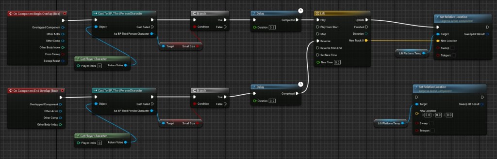 The Elevator Blueprint works by checking if the player character is in the small state. if they are then the elevator will rise. If they are not then nothing will happen. When the player leaves the elevator then the animation will play in reverse, lowering the elevator again.
